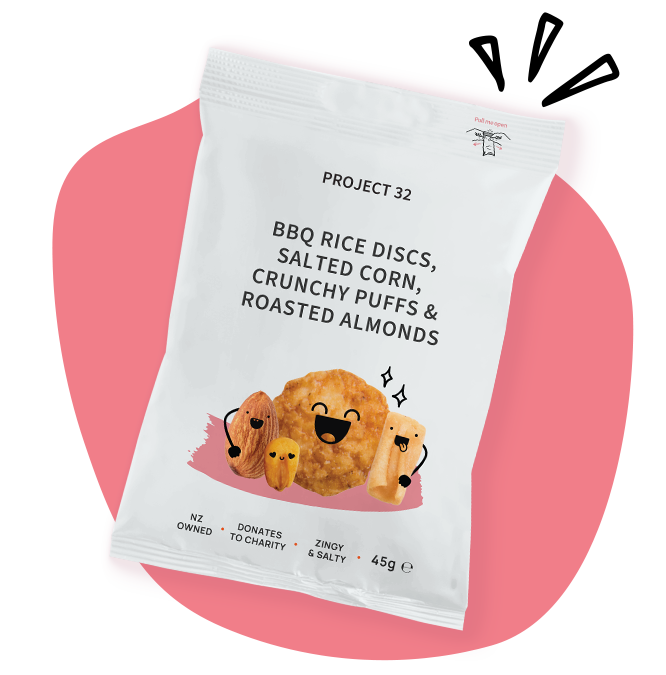 All Project 32 snacks are either made or packed in New Zealand, by New Zealand factories and staff. We also engage in a charitable giving program which benefits only New Zealand charities for the benefit of the local community.